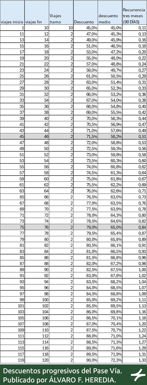 - A partir del viaje 41: cada dos viajes se añade un 0,5% de descuento. ¡Hasta el 90!